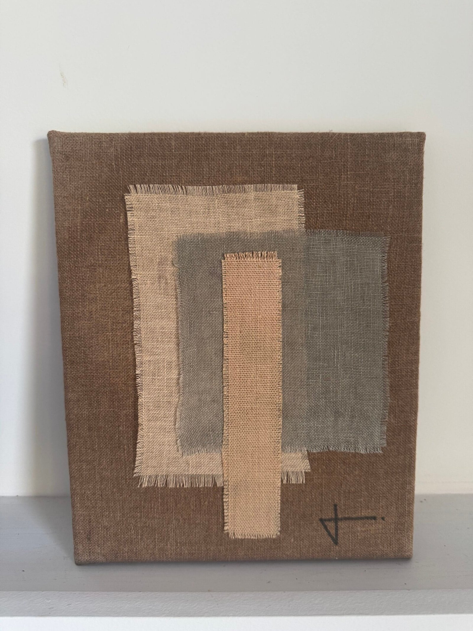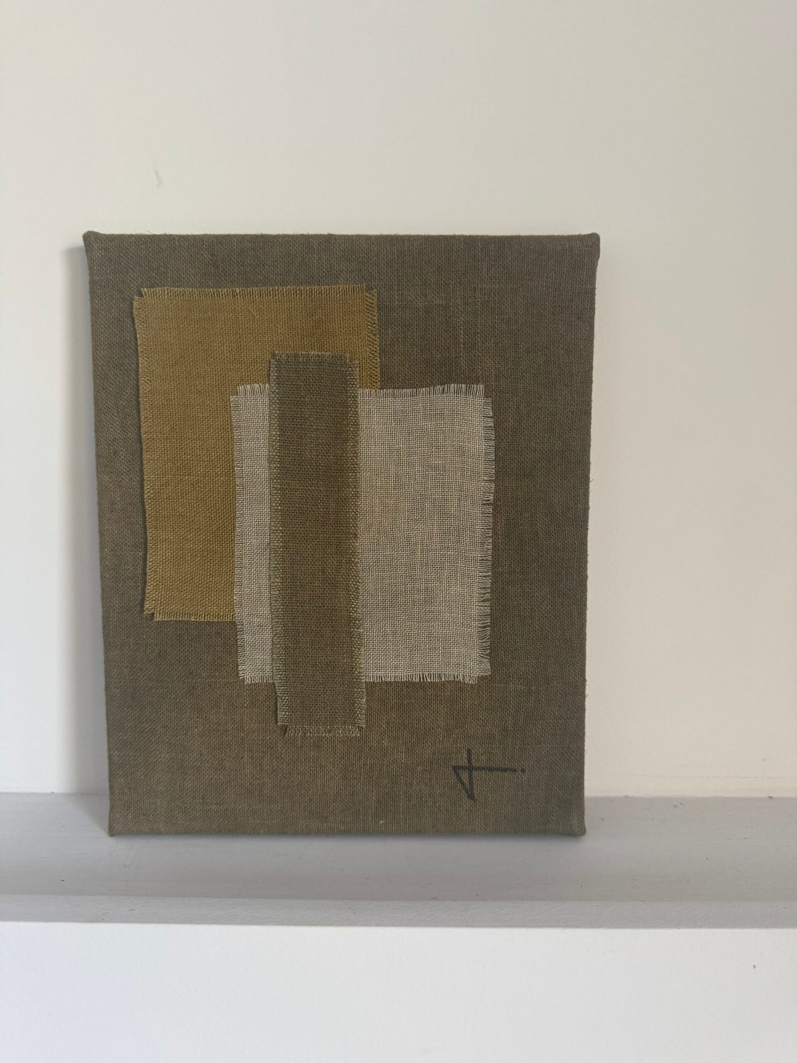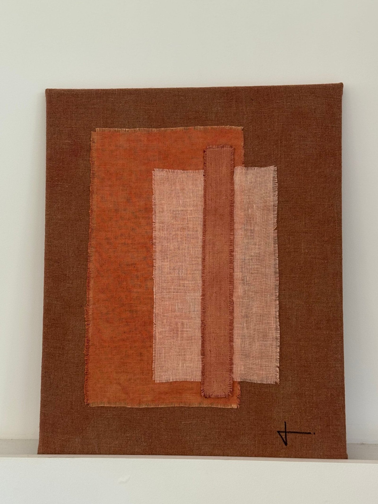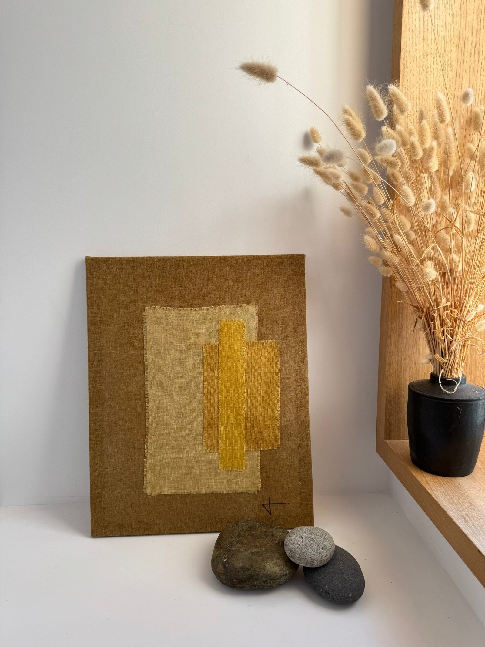 Toutes les pièces de lin sont teintes à partir d’une même plante, jouant sur les différentes nuances obtenues par des variations de teinture (temps de cuisson, PH de l’eau, couleur du lin avant teinture, …)